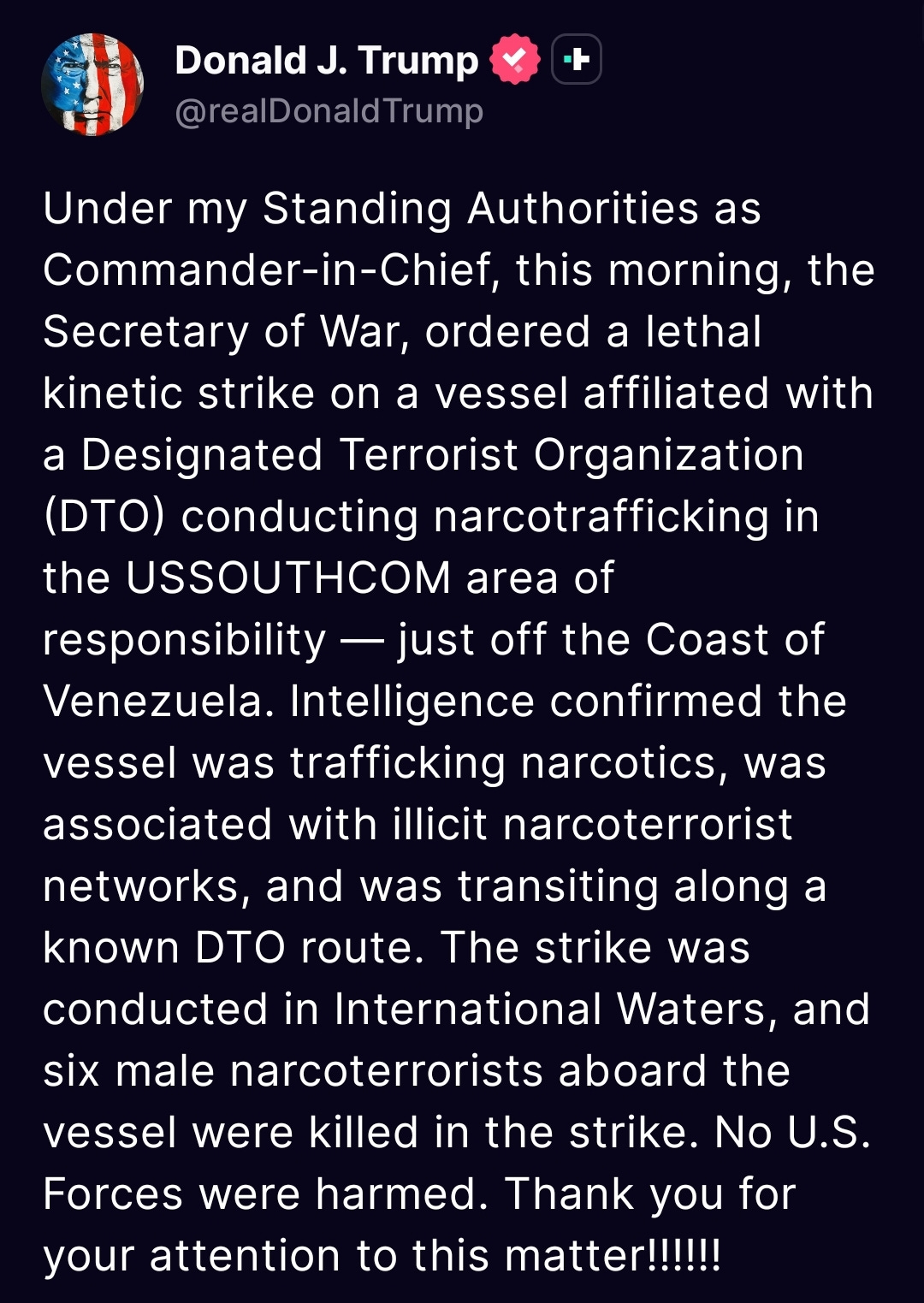 Standing Authorities as Commander-in-Chief, this morning, the Secretary of War, ordered a lethal kinetic strike on a vessel affiliated with a Designated Terrorist Organization